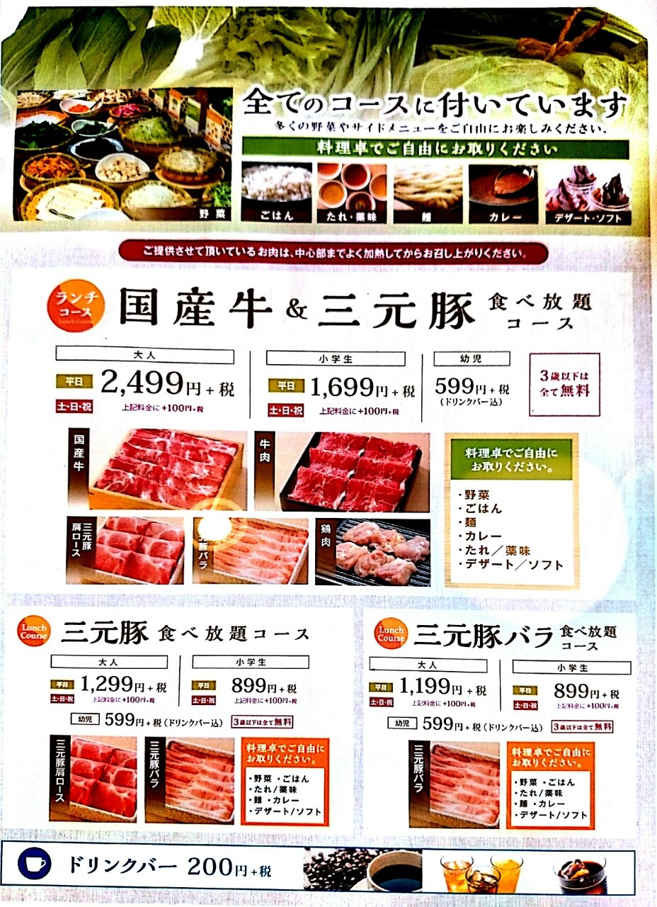 三元豚のバラのみと60分という制限はありますが、こちらのコースだと 何と999円(平日)にてしゃぶしゃぶ食べ放題が食べることが出来ちゃいます。 (期間限定ということですが終了時期は未定で暫くは続ける予定とのことです)