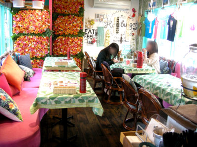 店内に入ると、壁を埋め尽くすハイビスカスの装飾があり、雰囲気はまるでハワイのコンドミニアムのよう!
