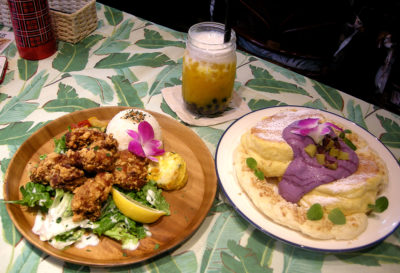 同店オススメのホノルル料理は、現地で定番料理である唐揚げの「モチコチキン」と、デザートの「紫芋バナナのパンケーキ」!