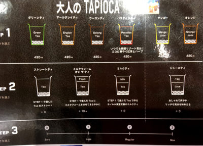 大人のTAPIOCAと銘打ったこの方式は、まず元のドリンクがティーで4種類、ジュースで2種類の計6種類から選び、次に上からもうひとつミルクティーやクリーム、ジュースを入れるかどうかを選べます。