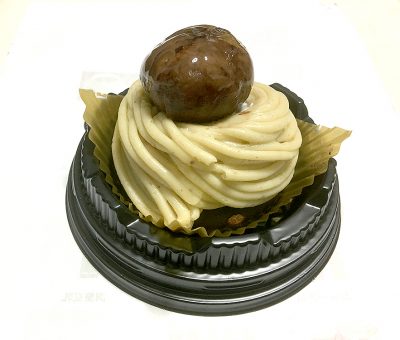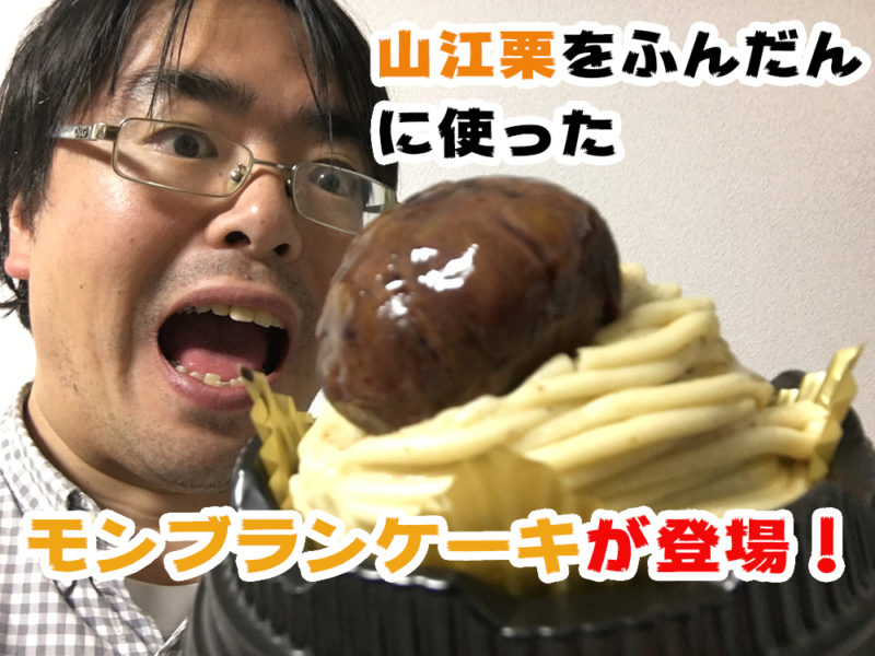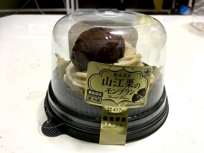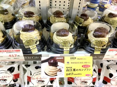 ローソンのケーキ棚の中心を飾るのが、今、絶賛売り出し中の「山江村のモンブラン」大きな栗が一際目立ちます!