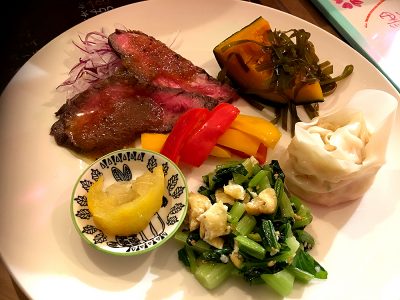 そして大皿に細かく盛られた料理の数々。少しずつ、品目を多く扱ったバランス良い栄養を考えた繊細なメニューです。