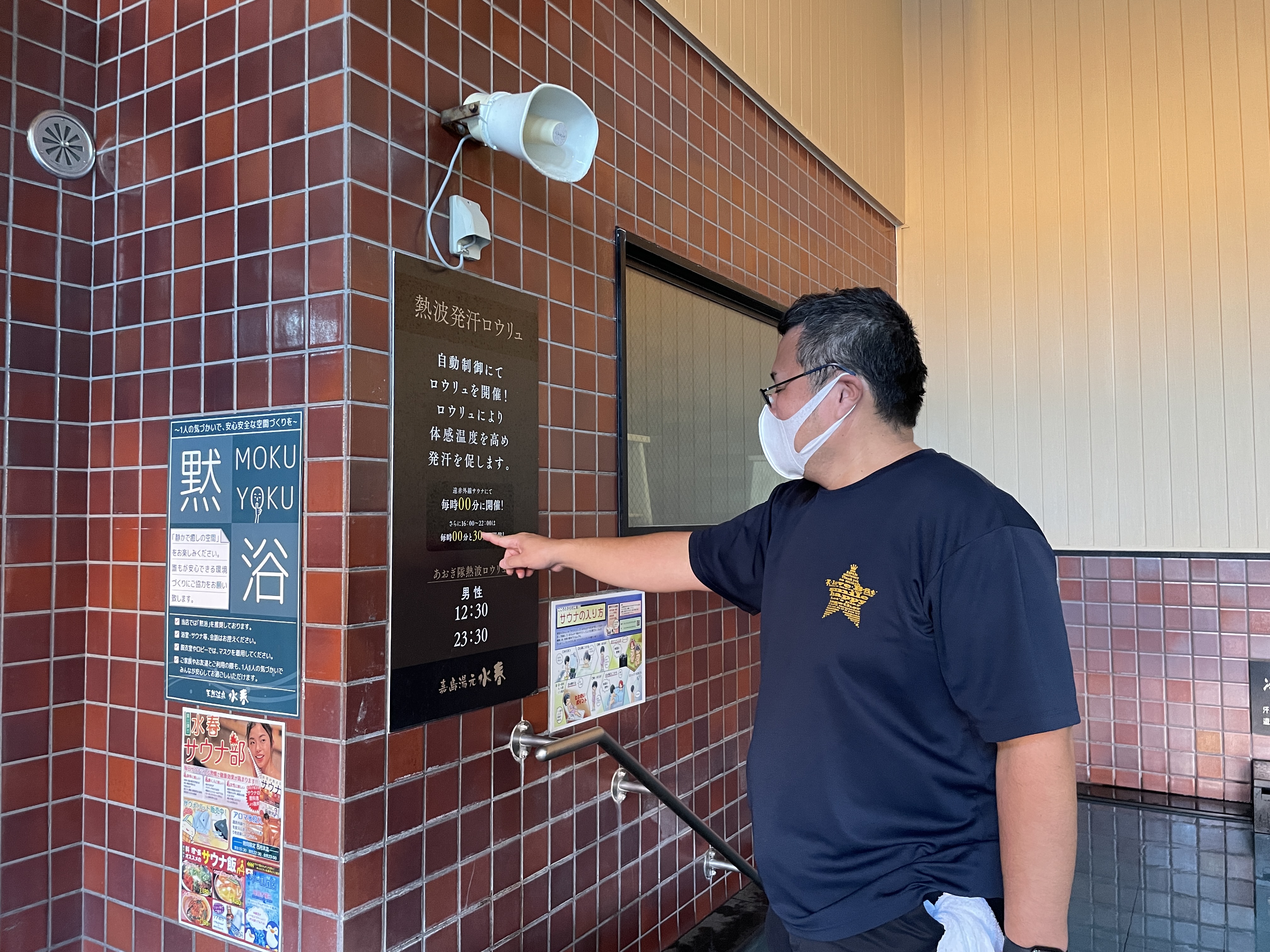 お茶のロウリュを香りを体験してみてください!と、いきなり店長さんが登場。