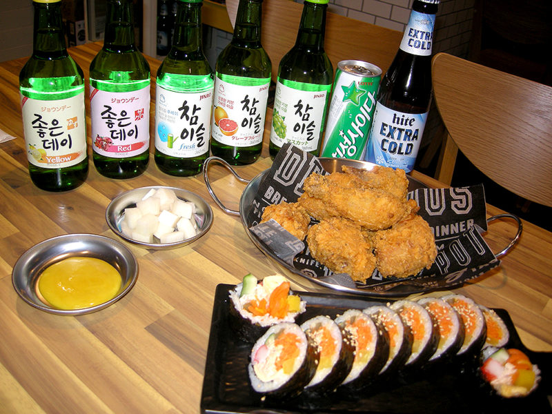 こちらが、キンパ(韓国海苔巻き)と韓国チキン。そして奥に並ぶのは韓国で人気の韓国焼酎のフルーツフレーバー5種類、韓国産サイダー、韓国ビールです。