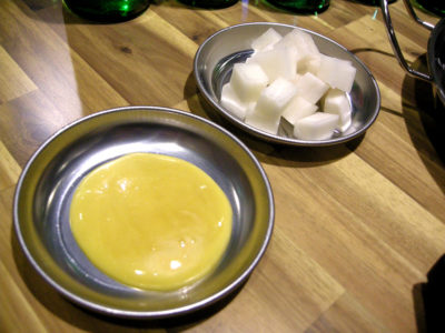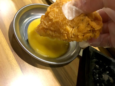 チキンは割とあっさり味なのですが、脂の口直しに大根の酢漬けが付いてくるのが本場韓国流!この黄色いタレはハニーマスタードです。
