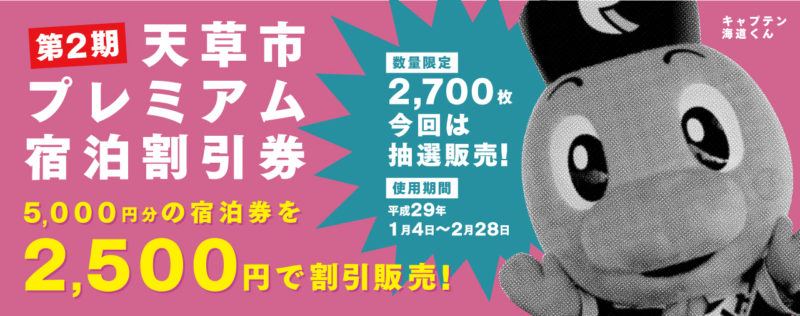 天草宝島観光協会では2016年12月5日より、天草市内の対象宿泊施設で利用できる5,000円分の宿泊割引券を2,500円で販売開始します。