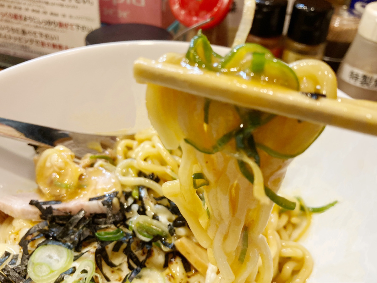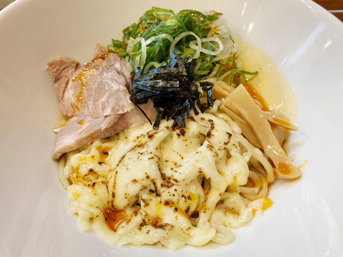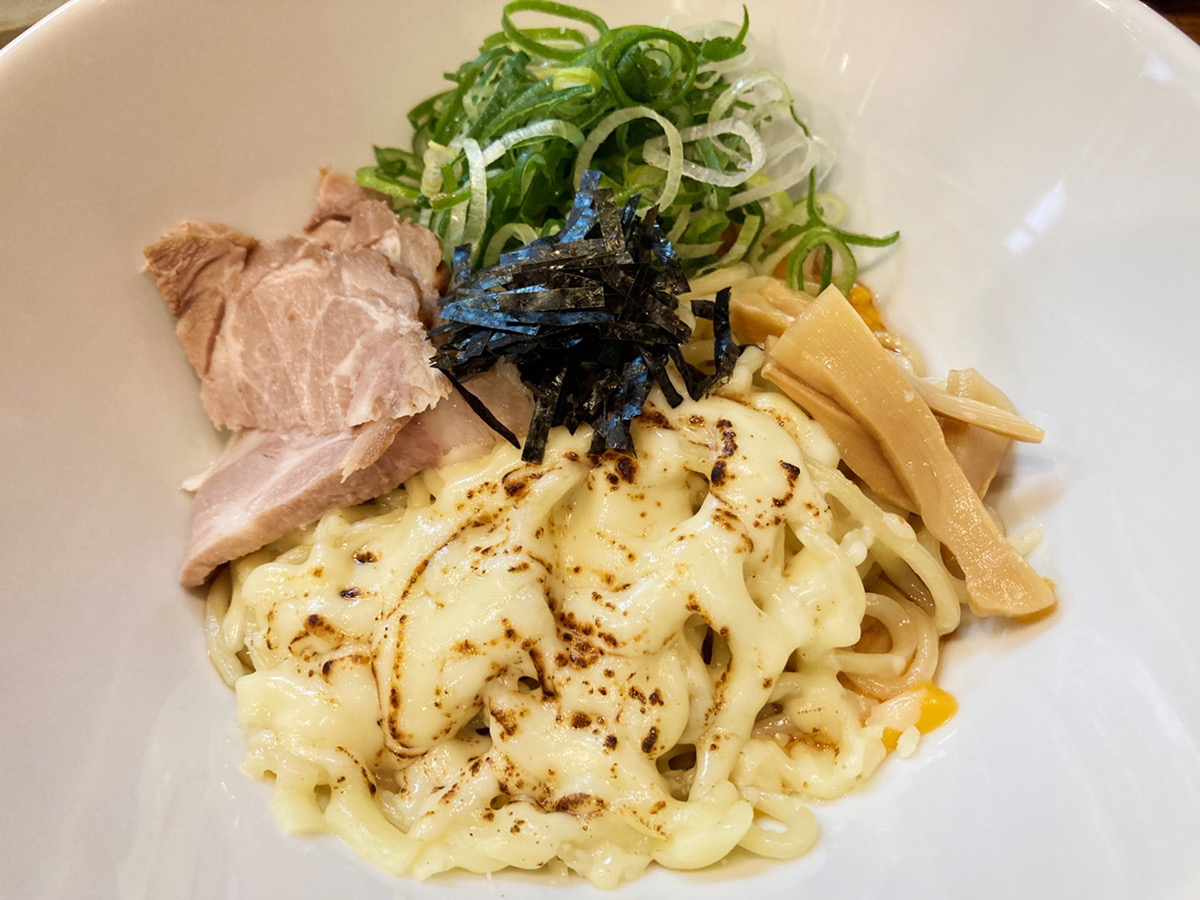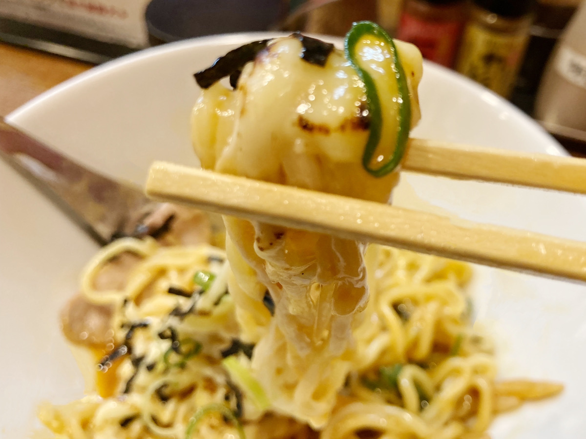 生卵を絡めるとまた違った美味しさ。チーズのマイルドさに卵のコクが加わってちょっと深みが増す味わい。マイルドな油そばも美味しいですね。