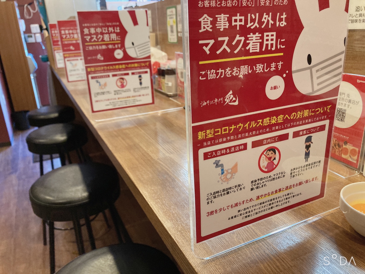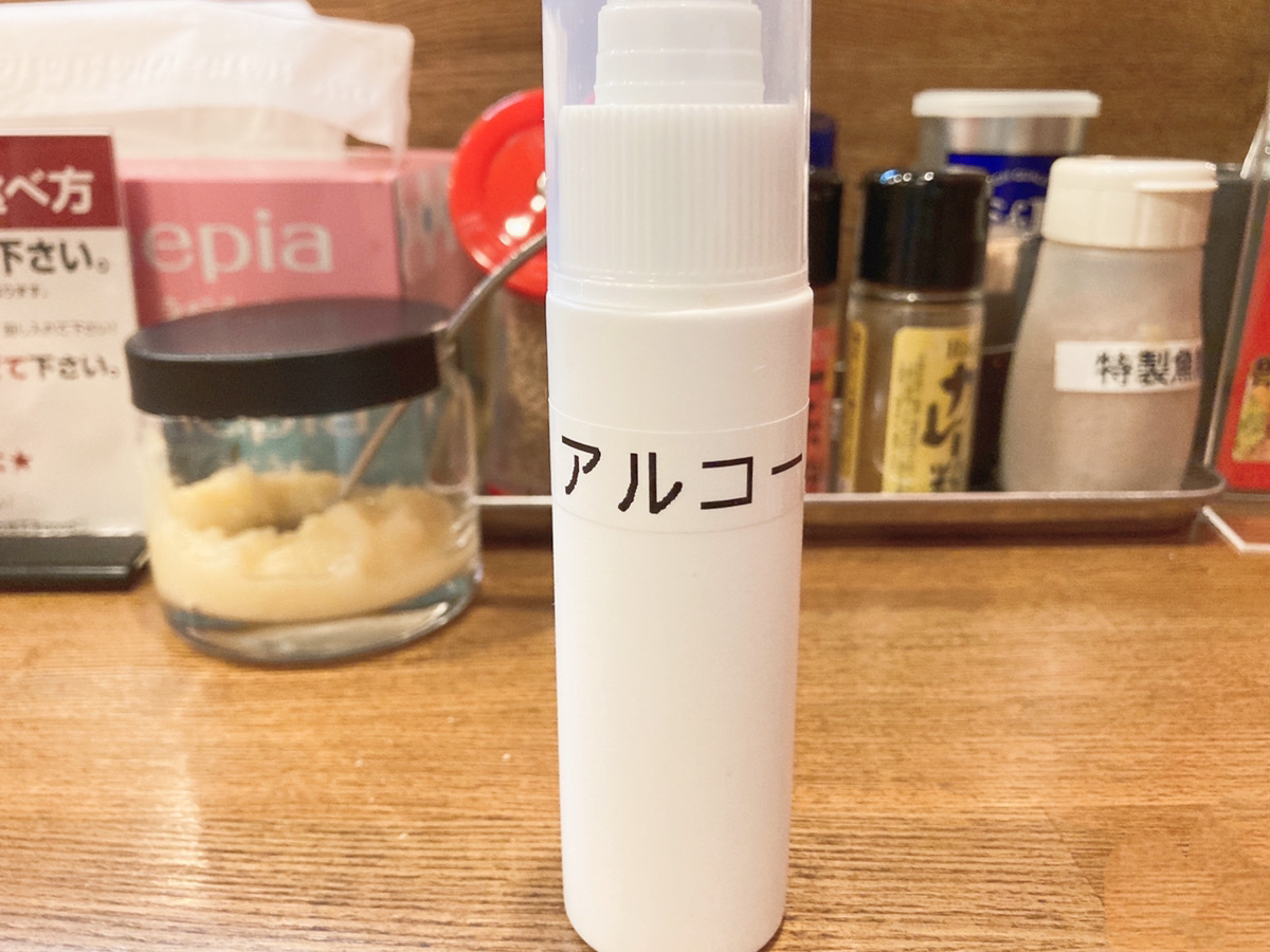 席ごとに消毒用のアルコールがあるのも嬉しいポイントです。