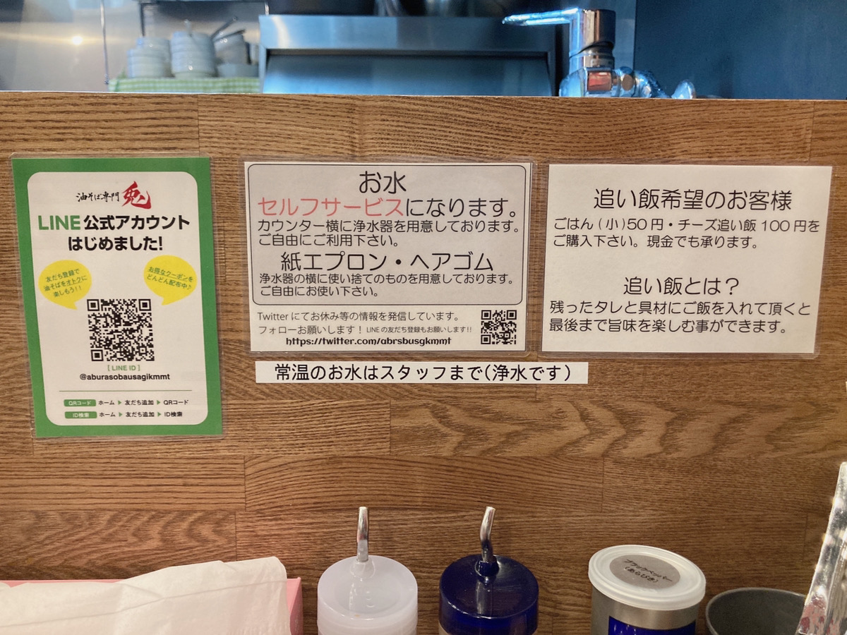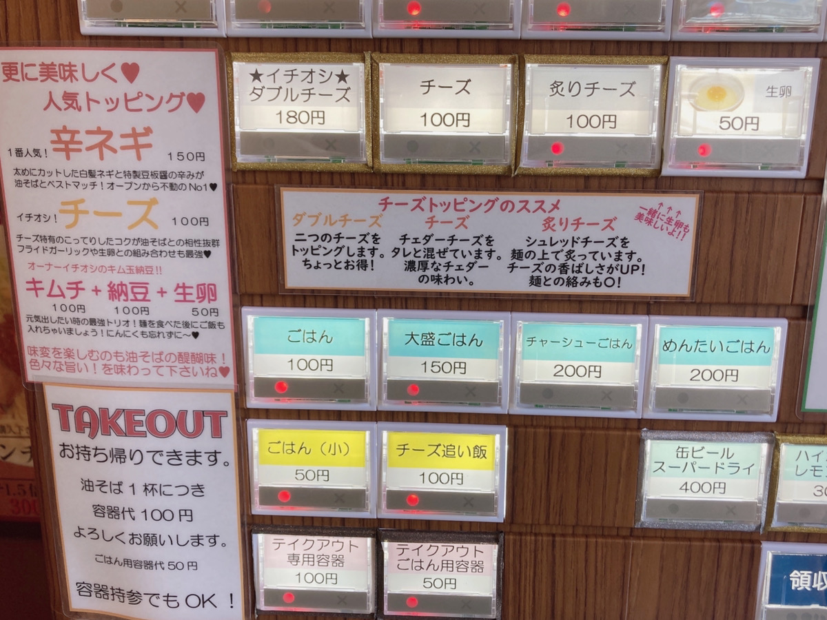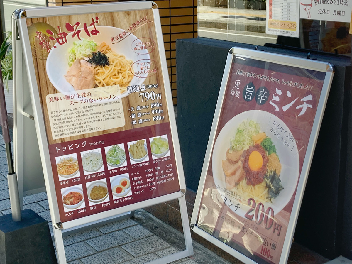 油そばはシンプルそう。だけど、トッピングが沢山あるみたい。迷いますね…とりあえず中へ入ります。