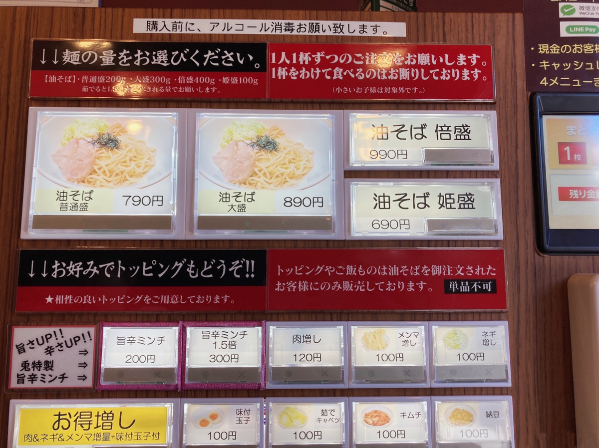 中に入るとスグに券売機があるのでここでメニューを決めましょう。メニューはシンプルに油そば1種類。
