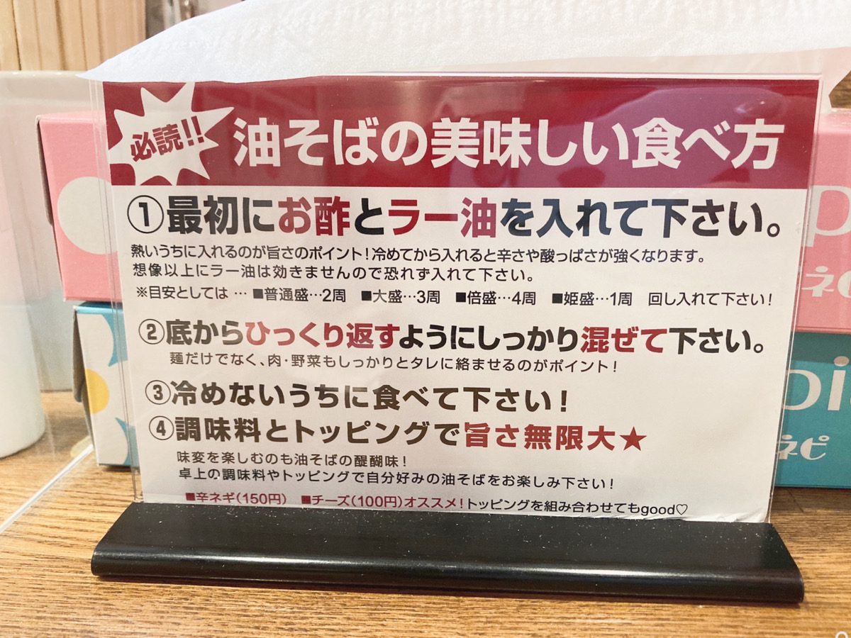 【閉店】トッピングで自由自在の愉しみ方ができる「油そば専門 兎 熊本市役所の裏店」は女性にも優しいお店でした。