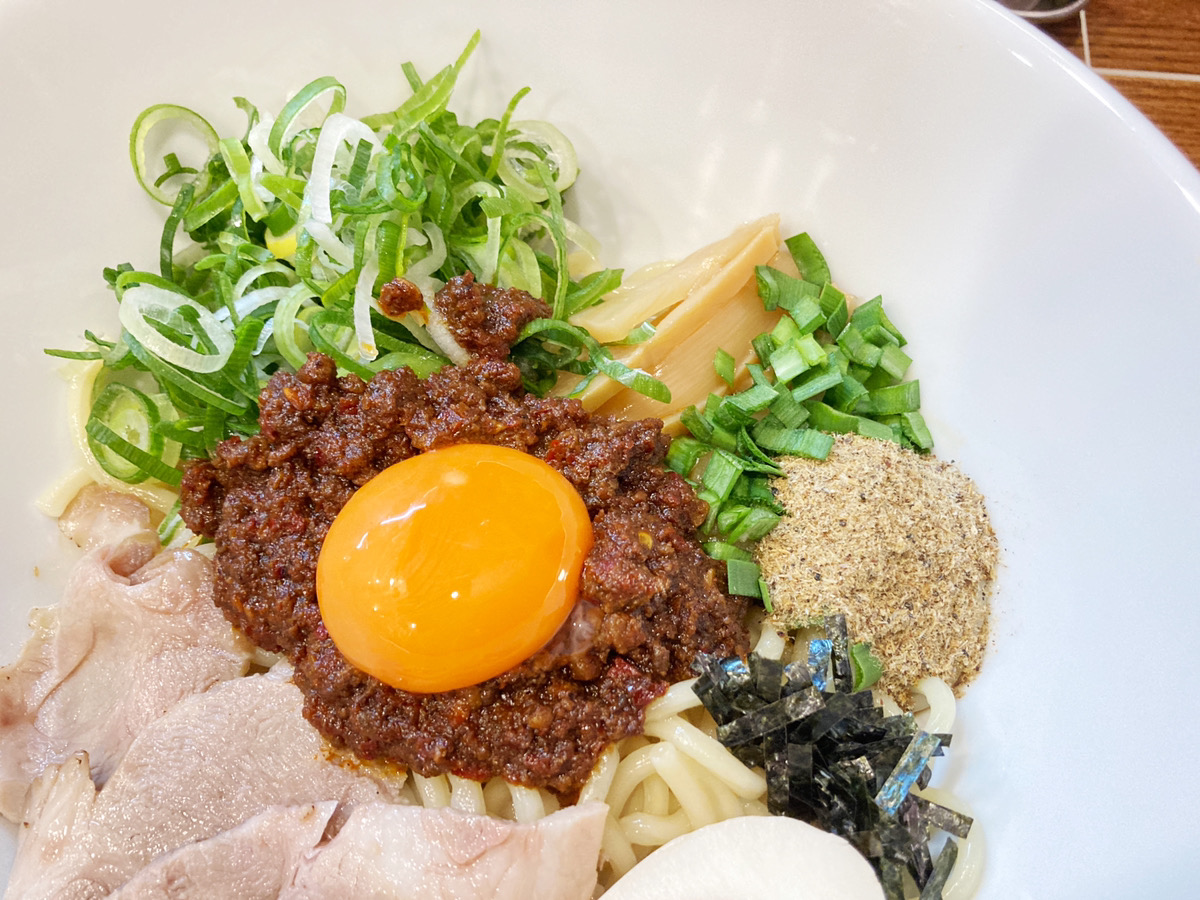辛いのが好きな方におすすめのトッピングは旨辛ミンチ(200円)!この油そばには追加で味付玉子(100円)が乗っています。※麺は姫盛です