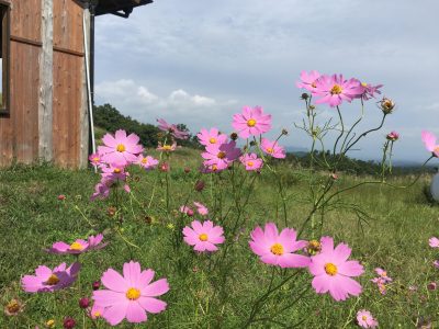 かたわらには、ピンクのコスモス。山に訪れた秋を感じさせてくれます。