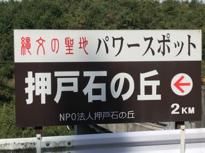 「縄文の聖地 押戸石の丘」という大きな看板が現れます。そこから右折し、押戸石の丘へと車を走らせます。