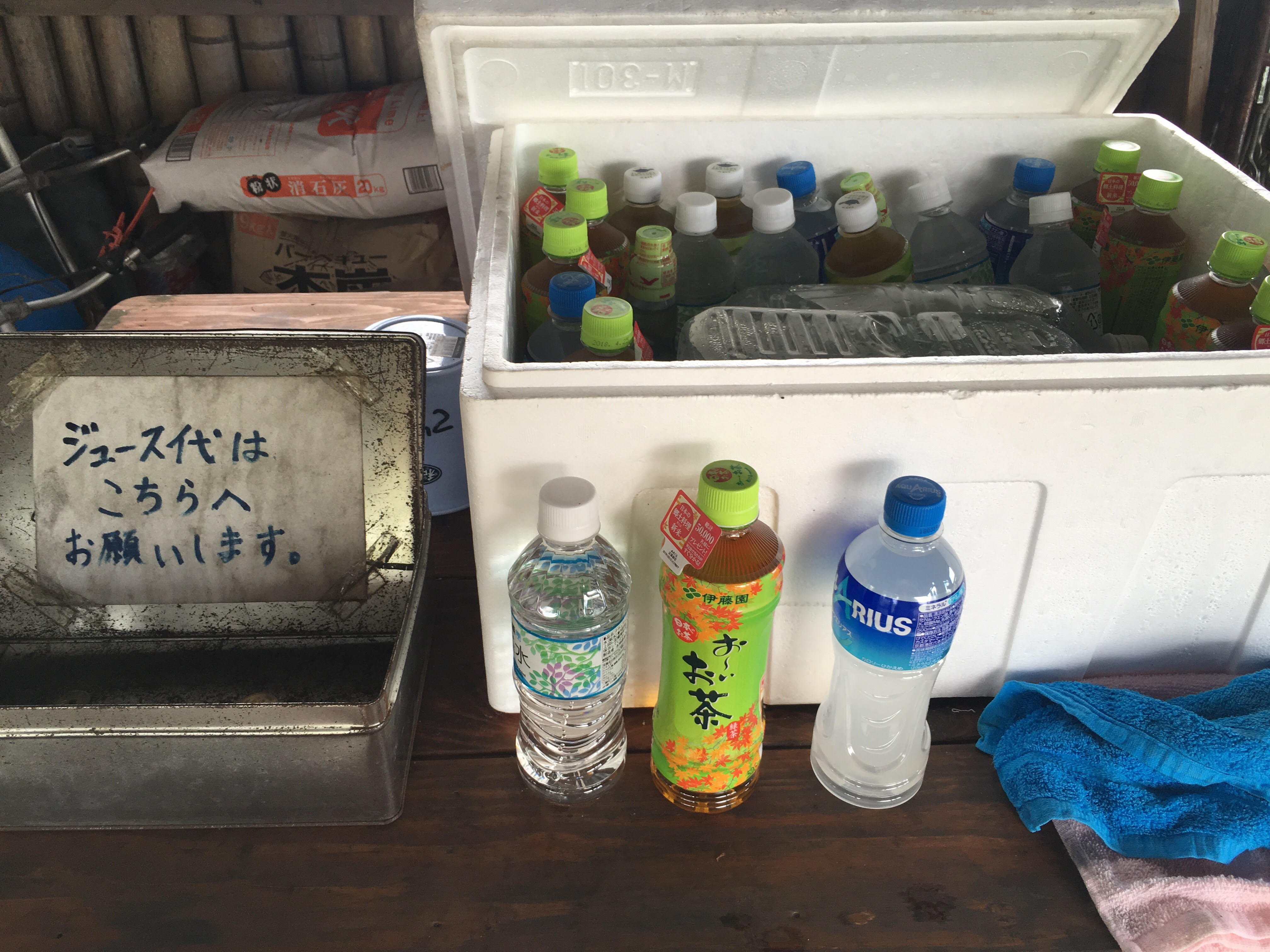 管理小屋横では、ジュースが販売されていたのですがなんだかゆるい販売方式!発泡スチロールにたくさんの飲み物があり、お支払いは缶に入れるという、無人販売形式です(でも、隣には管理人さんがいます)。