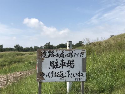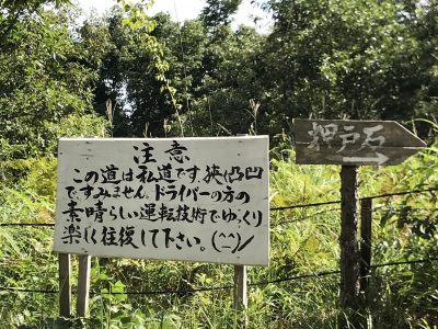 狭い砂利の道が続きますが、途中、顔文字つきの手書きの看板が、ドライバーを励ましてくれます。