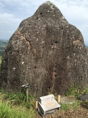こちらが太陽石。頂点の真北に北極星があり、コンパスを持ってこの石に近づくと針がまわるという不思議な石です。説明書によると、鬼たちがこの石でお手玉をして遊んだという伝説もあるようです。