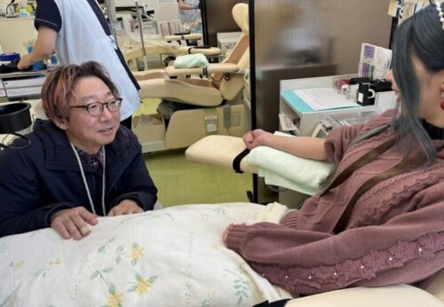 「大丈夫ですよ。ほら見てください、今日は60人の献血が必要なのにまだ16人しか来てないみたいです」