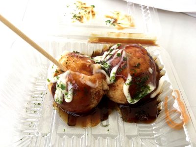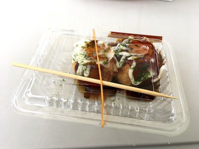 ちょうど焼き上がりたての熱々のたこ焼きです。どの店も大行列のためたこ焼きをストックする余裕が無く、結果、どの店も一番美味しい出来立てが提供されていました。