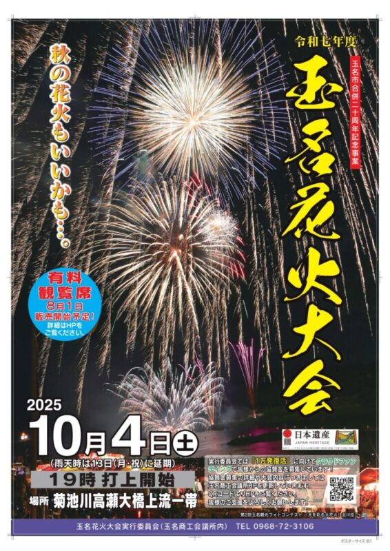 精鍛な菊池の衆の有志とラストを彩る花火は必見です。なお当日は交通規制があるので注意が必要です。