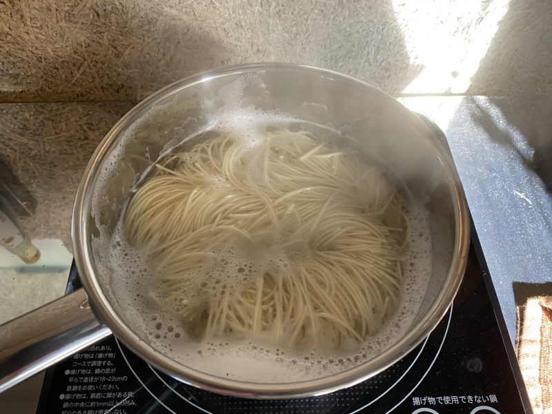 まずは麺を3分茹でて…