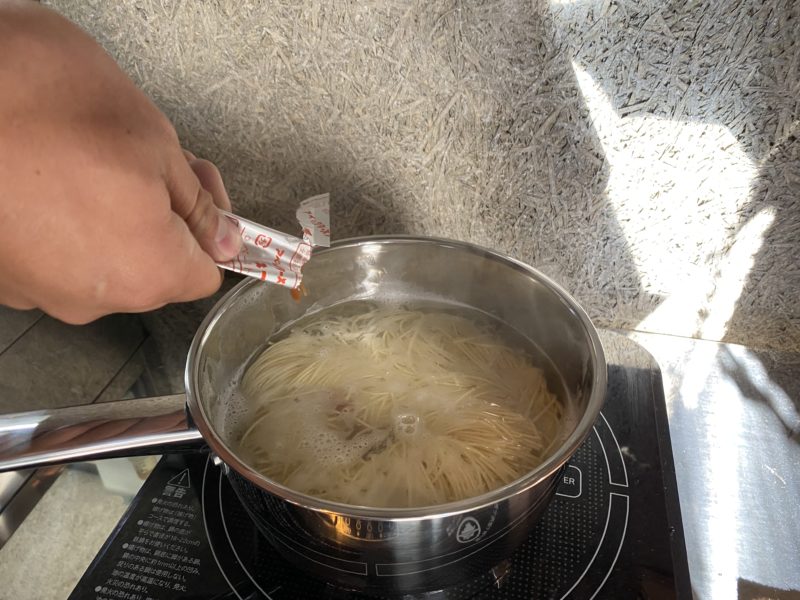 アベックラーメンは3分でしたが、こちらは3分半ゆでます。それに調味油がついていました。