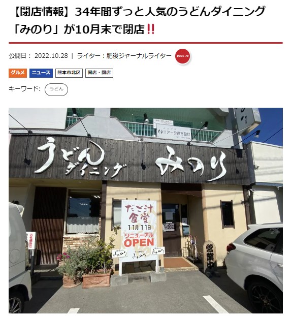 肥後ジャーナルライターが書いた「うどんダイニングみのり閉店」の記事が1位。