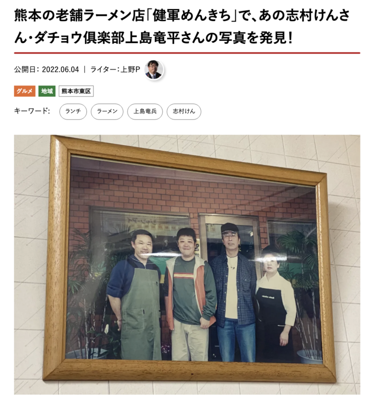 惜しまれながらこの世を去った「上島竜兵さん」と「志村けんさん」が訪れた、健軍めんきちの記事が2位。