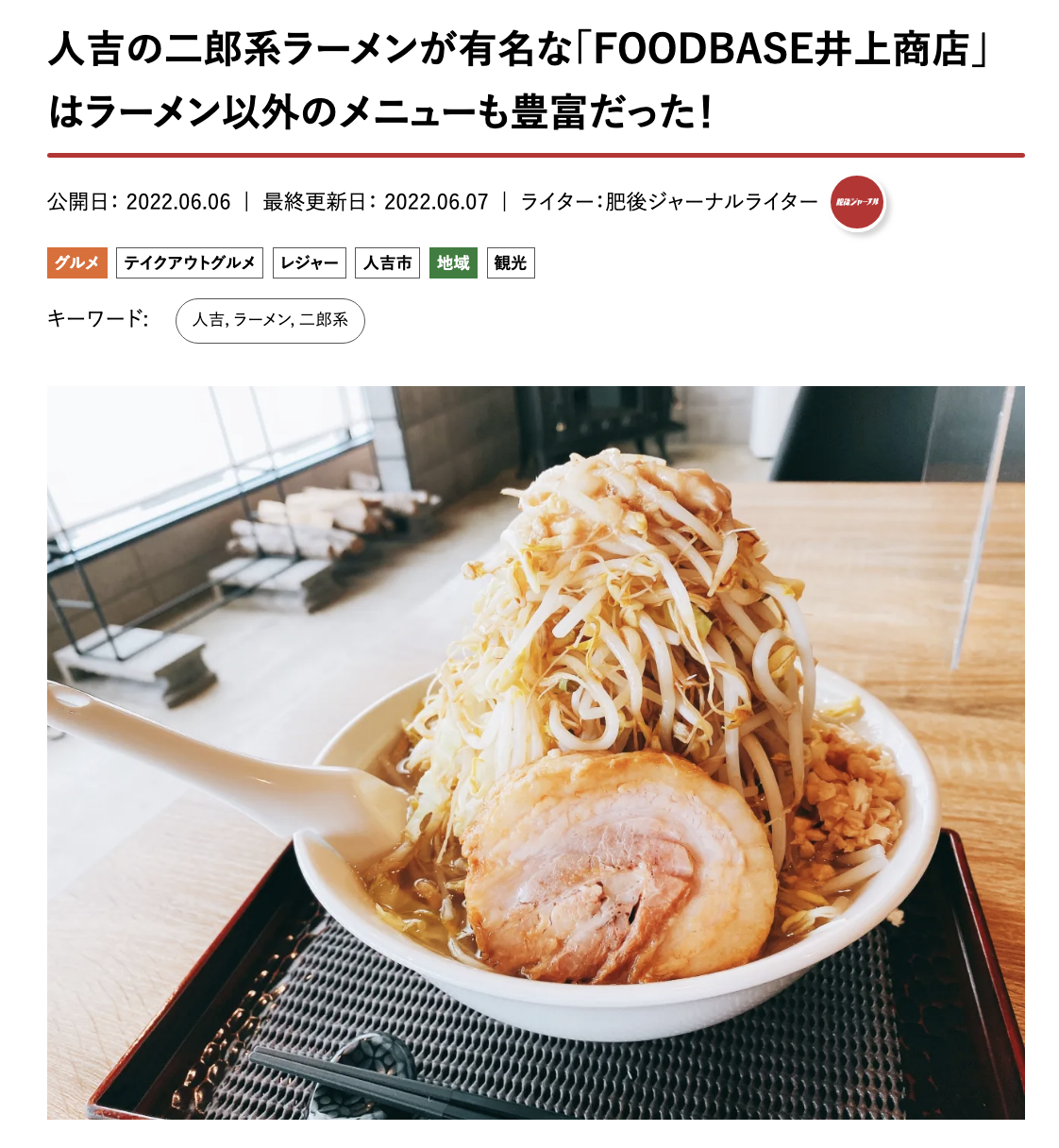 5位は、人吉にある二郎系ラーメン「FOODBASE井上商店」の記事。