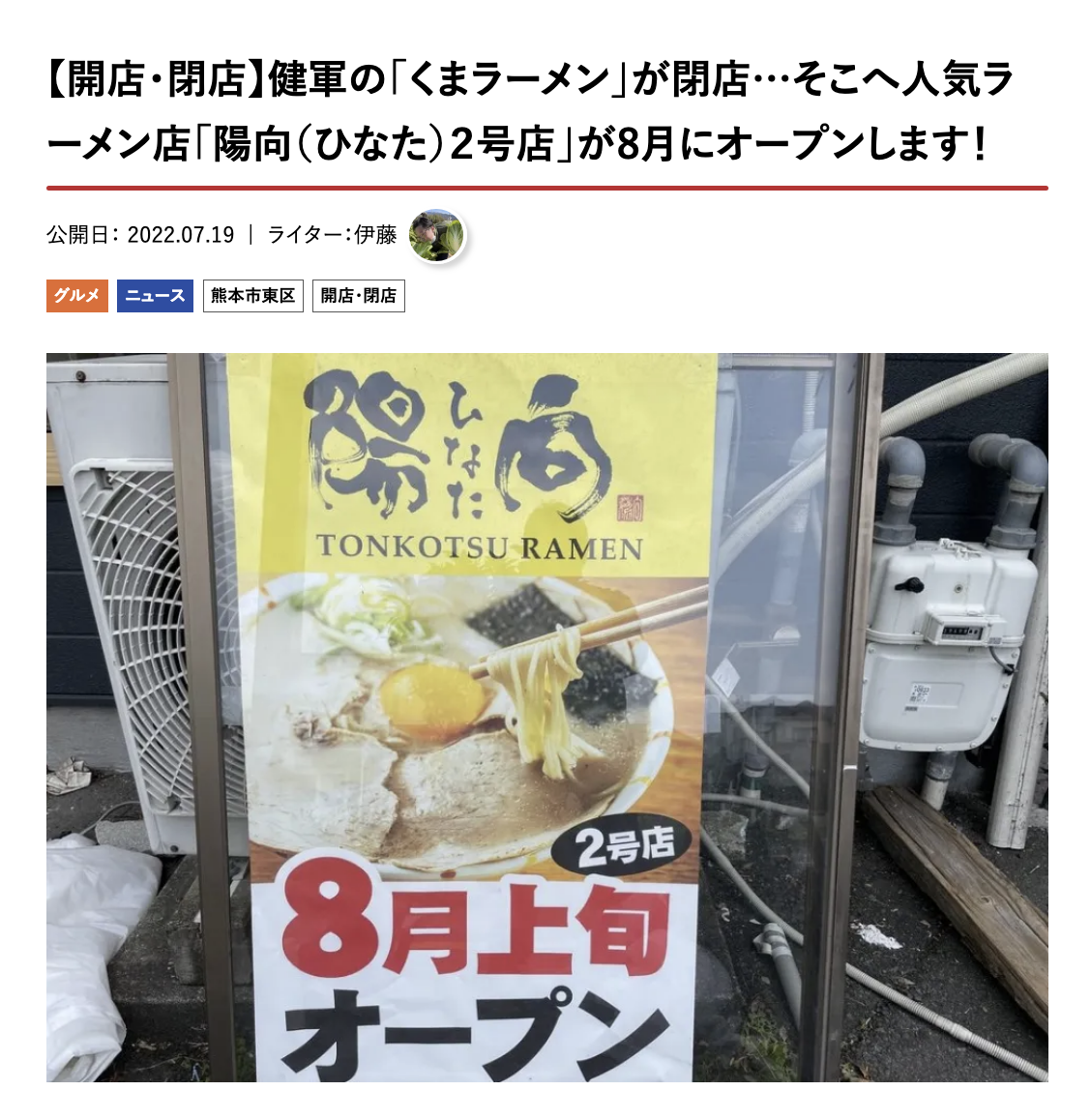 「くまラーメンが閉店し、跡地に陽向2号店ができる」の記事が4位。