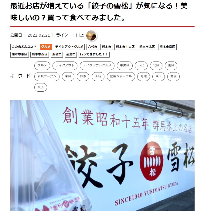 「餃子の雪松」は熊本県内に全7店舗。群馬県生まれの餃子、キャベツたっぷりでヘルシー美味しーつくりやしーの3拍子揃った餃子でした。