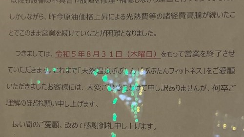 なんと、「天然温泉ぶぶたん」と「ぶぶたんフィットネス」が8月31日で営業終了。