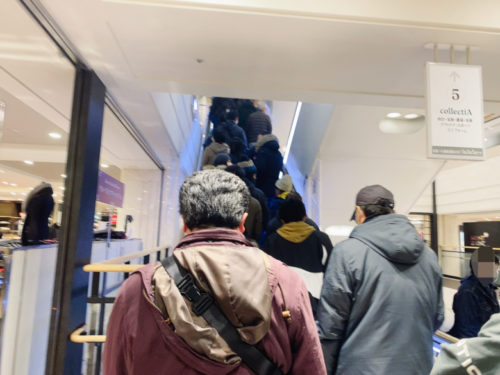 エスカレーターから見えた列は、まもなく買える組なんですね。今来たレベルだとこのホール内で待たなくてはなりません。
