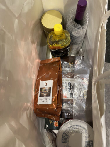 ・ボトルワイン ・一番摘み有明海苔 ・チョコレート詰め合わせ ・KEY COFFEEセット ・スペシャルブレンドコーヒー(豆) ・オーガニックスパゲッティ ・人吉茶 ・りんご 3個 ・吊るしベーコン ・明太子 |