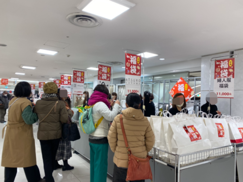 待つ時間、暇なので周りを見わたしたところ、すでに鶴屋の福袋を手に持った方がチラホラ。