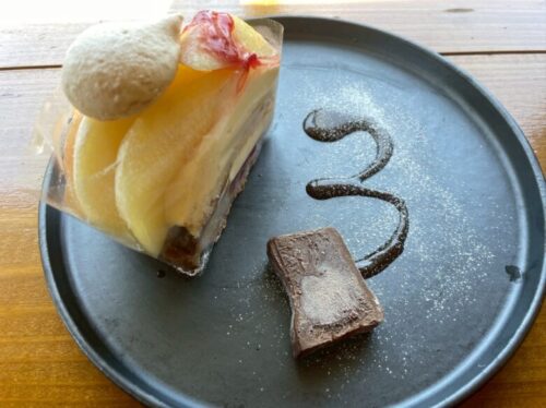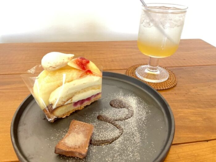 いろいろあって悩んでしまいますが、桃のタルトとレモネードをイートインでいただいてみました。