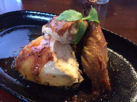 1羽まるごと串に刺して回転させながらあぶり焼きにした料理。