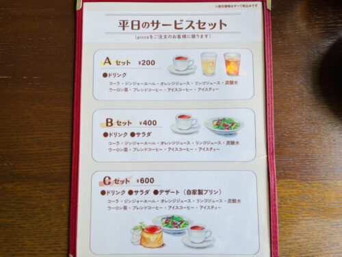 ピザのメニューはこちら!イラストで描かれたピザ、想像力を掻き立てられて味わいがあるもんですね。