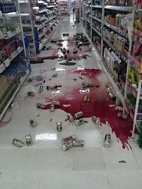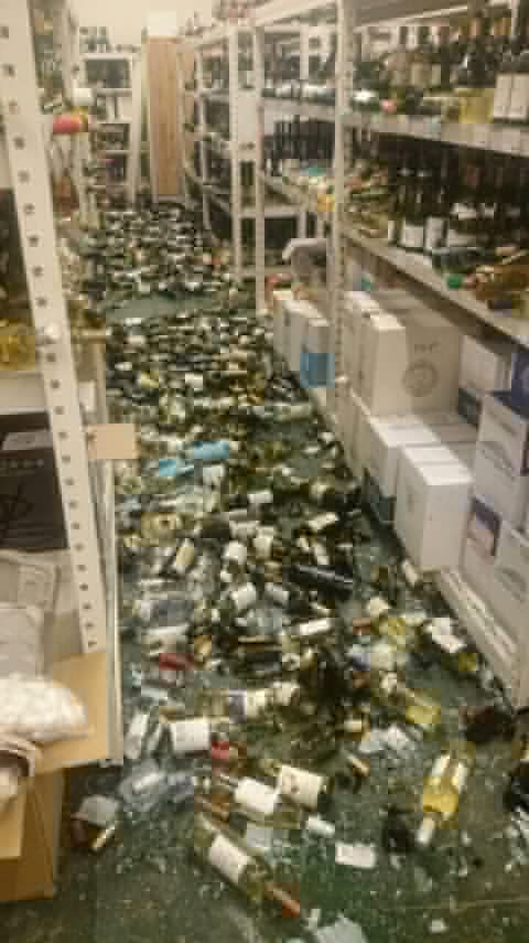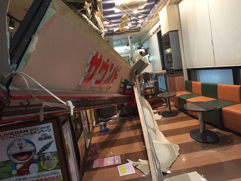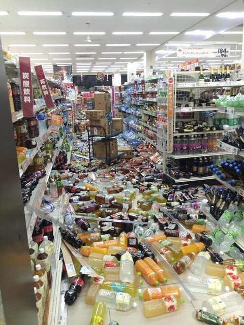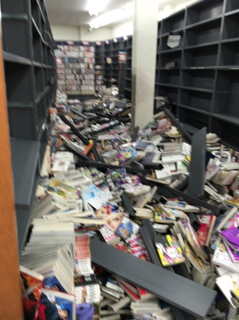 陳列棚が激しく移動していたり地震の恐怖を物語ってます。