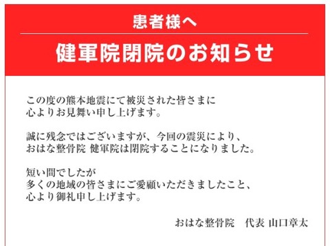 おはな整骨院 健軍院が震災の影響により閉店