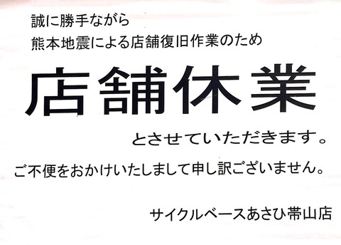 サイクルベースあさひ帯山店が震災の影響により店舗休業