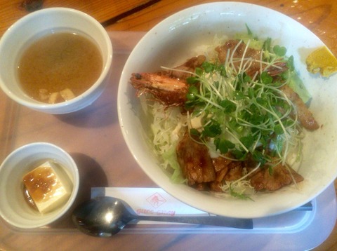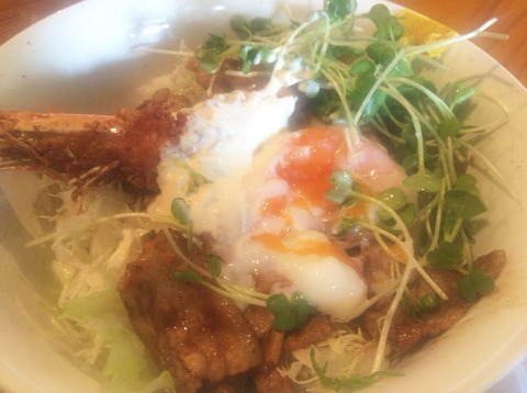 どんぶりには大きいエビフライ 豚バラ肉とカイワレ大根 レタスなどが入っており