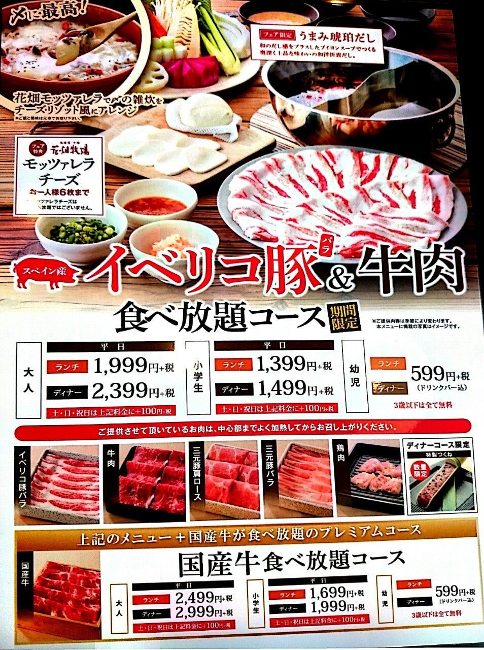三元豚のバラのみと60分という制限はありますが、こちらのコースだと 何と999円(平日)にてしゃぶしゃぶ食べ放題が食べることが出来ちゃいます。 (期間限定ということですが終了時期は未定で暫くは続ける予定とのことです)