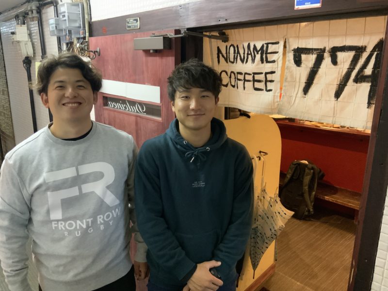 出迎えてくれたのは、「NONAMECOFFEE」の岡田修人さん(左、立命館アジア太平洋大学4年)と、山下璃久さん(右、東海大学4年)。
