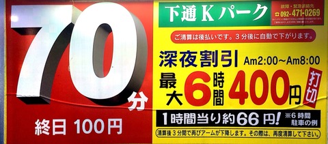 22:00~翌8:00まで 60分毎100¥ 最大打切 400円