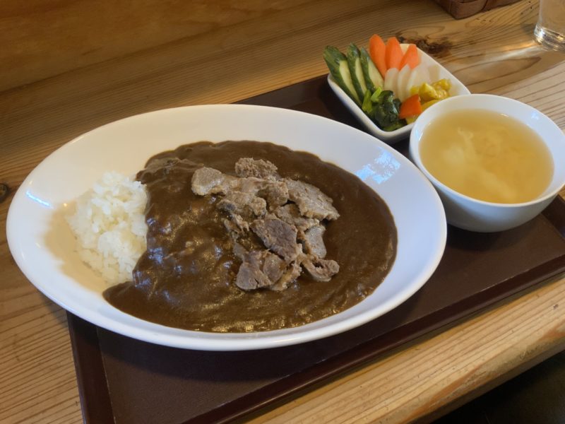 こちらが「馬すじカレー」。スープとお漬物が付いています。この日は自家製のぬか漬けがたくさんあったそうで、漬物多め。
