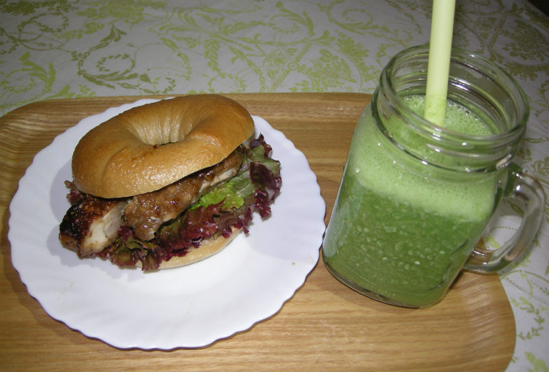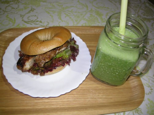 毎回具材が変わるベーグルサンドセットです!今回は肉の旨味もたっぷりのチキン照り焼きサンドでした。ドリンクには人気のグリーンスムージー。