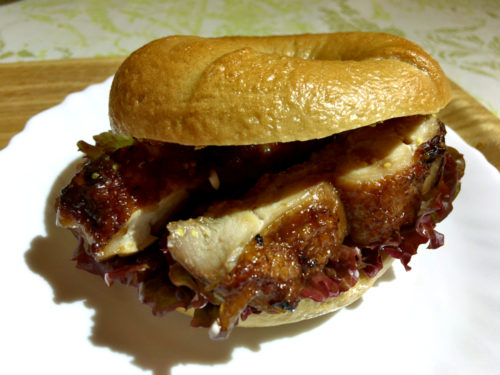 ベーグルに収まりきれないボリュームのチキン!ベーグル以外の素材も極力オーガニックを使っていて、レタスなどの野菜の一部は自前の家庭菜園のを使用しているそう!ベーグルサンドの内容は日替わりです!