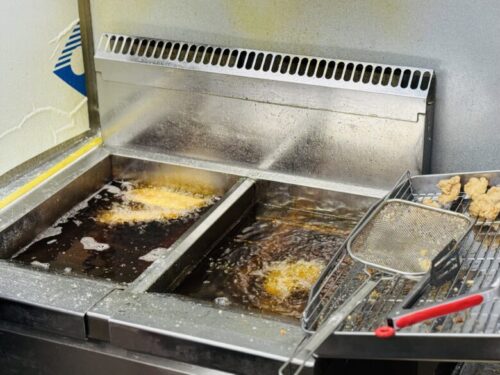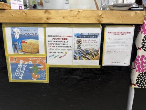 じゅわ~~~という心地よい揚げ物の音。わ~良い香りでお腹がぐぅー。女性の方がアジフライを数枚購入されておりました。