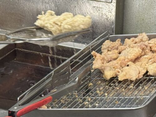 ざっと次々に揚げられる鶏肉の胸肉。こちらのチキン、タルタルが無くても美味しいんですが、その美味しさは企業秘密。